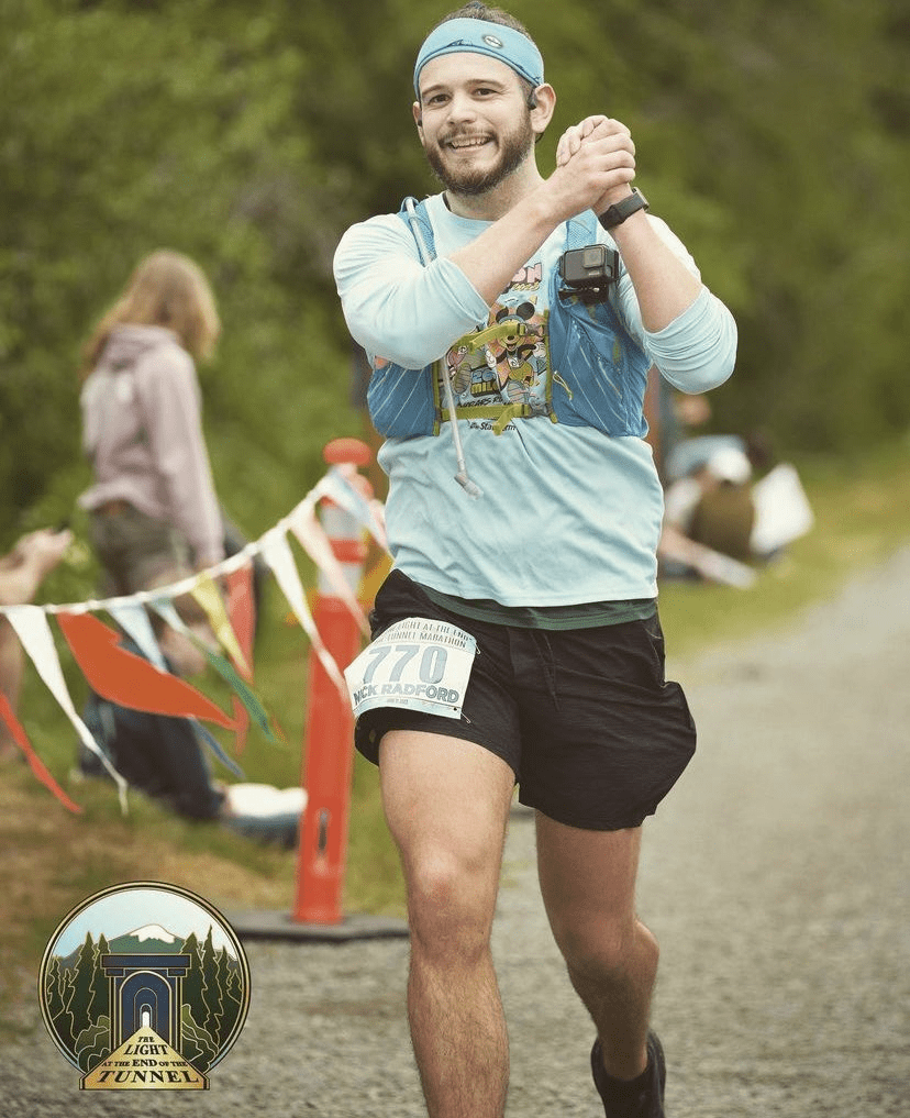 I can safely say that this was my favorite marathon experience yet. This is probably due (in no small part) to the fact that it is entirely downhill, as we run from the top of a mountain to the bottom, only to get shuttled back to our cars at the start. Another factor that helps this marathon’s case for my favorite, is that it starts with a two-and-a-half-mile-long tunnel with no light. It’s an old train tunnel that has been converted to be part of the trail and is the inspiration for the name of the race. We were highly encouraged to bring our own headlamps for this part of the course and it even had a table set up at the end of the tunnel to drop off the lamps once we were done with them, to be transported to the finish line for pickup. I opted to just stick mine in my pocket since I’m not a huge fan of having to pick up my things after a race–I just want to get the heck out of there so I can eat and rest.