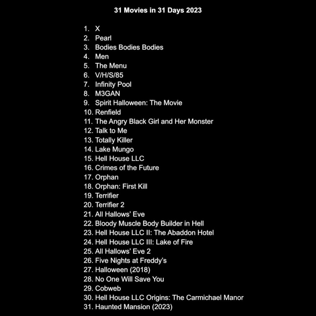 A tradition that started–I think– half a decade ago has become an integral part of my spooky season celebration, and was especially difficult to keep up with, in conjunction with wrestling and training for my first ever 50K (a whole blog on that coming soon). Gone are the covid times that allowed for 61 Movies in 61 Days, because I had nothing else going on. Now, more than ever, I’ve found my yearly movie marathon to be necessary to catch up with all the more recent horror movies. Outside of October, I think I only watched three spooky offerings this year: Scream VI and Evil Dead Rise (both stellar entries in their respective franchises), plus Skinamarink (a movie that I didn’t enjoy in the moment, but haven’t been able to stop thinking about since). It truly feels like we’re living through a horror renaissance with all the new horror franchises cropping up.