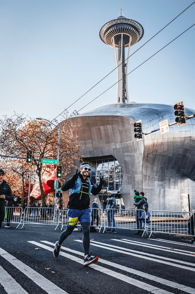 Finally, I saved one more story to wrap everything together in a neat package. Hot Academy Summer was the busiest I’ve been in a while. The latter half of the summer featured The Academy performing on multiple wrestling shows, nearly doubling our matches for the year over about three weeks. One specific weekend was particularly notable for how much we had going on. It was Labor Day Weekend, and it seemed like everyone was taking advantage of the long weekend. PAX was happening in Seattle, DUSK Pro Wrestling invited me to make my return to wrestle in Vancouver, BC, for the first time since pre-pandemic, and Grit City Wrestling was holding the first-ever wrestling matches at Bumbershoot. I was there for it all, and I got some awesome pictures wrestling under the Space Needle. Fast forward to a few months later–Thanksgiving weekend, one year after I finished my first marathon. The Seattle Marathon Association implemented a lot of changes since then. One change was that the Seattle Marathon Summer Events added a half marathon to the 5K and 10K that runners could participate in. Not only did I run that race, but I booked it to wrestling training right after. Another change was the location of the start and finish lines for the Seattle Marathon. Last year, when I did the marathon, the starting and finish lines were at Husky Stadium on the UW campus. This year, they serendipitously moved the starting and finish lines to Seattle Center. I made a point early on not to repeat races. There are so many around that it felt unnecessary to do repeats. But since they also hold a half marathon during marathon weekend–at the same time as the regular marathon–I decided to check that off my list, too. Since the race now went past the Space Needle in Seattle Center, I got some pretty sweet pics running under it, in almost the same location I had wrestled under it a couple of months prior.